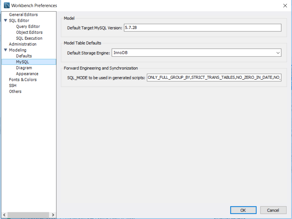 This was a little bit surprising for me since with SQL Server query syntax has mostly been backward compatible. To support the previous version of MySQL I had to update the MySQL default target version by going to Edit -> Preferences -> Modeling -> MySQL and setting the version to 5.7.28.